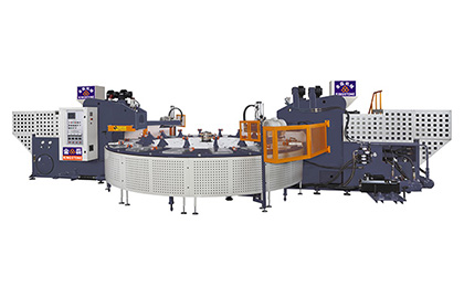 按圓盤機的機型分,分為單色機和雙色機、三色機等機型。其中單色機只有一臺主機,與臥式注塑機類似。雙色機有一臺主機和一臺副機組成。副機負責射膠、熔膠、上模、下模等動作,主機包含了副機的動作,且多了一個圓盤旋轉的動作,實現模具的移動和定位。三色機有一臺主機和兩臺副機組成。