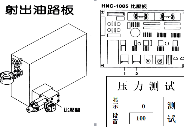 3、在【壓力設定】之【壓力測試】設定高壓100,看油表顯示是否為100kg/cm2,如否,則調整1處,高壓調整至相符。