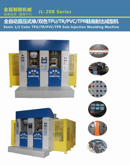 金磊鞋機能生產全自動圓盤式的鞋底射出成型機,全自動立式射出成型機,全自動EVA射出成型機等系列的鞋機產呂及相關配件,年產量達到150臺,龍其是公司自主研發的全自動的數控產品雙色機,能夠一次成型兩種顏色,而且擁有多項技術,可以生產出雙色或三色的鞋底,解決了傳統制鞋中多色鞋底需要膠水粘連的問題,打破國外同類機械壟斷。